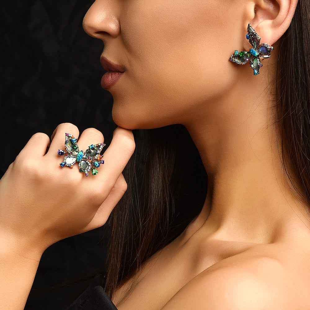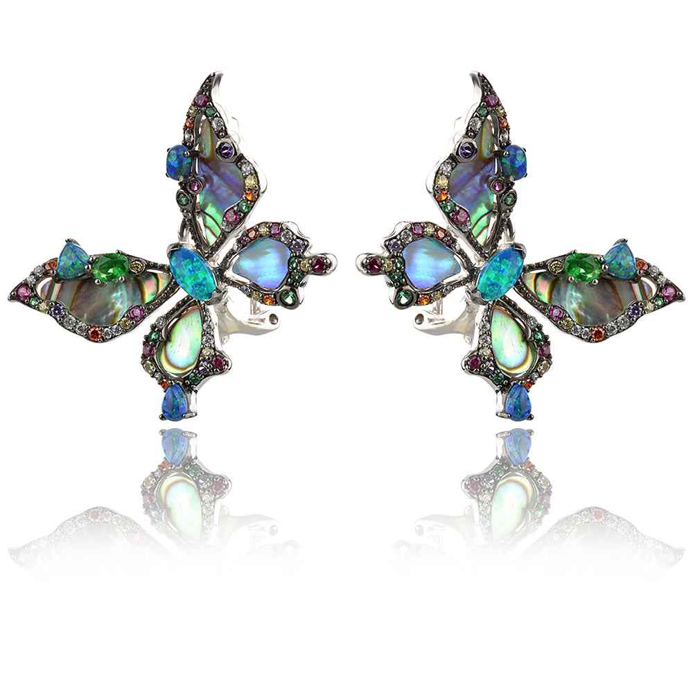 Изящни сребърни обеци на италианския луксозен бранд GANEZZI. Една цветна еуфория от кралски седеф, син опал, малки корунди и цветен циркон във формата на нежни пеперуди.