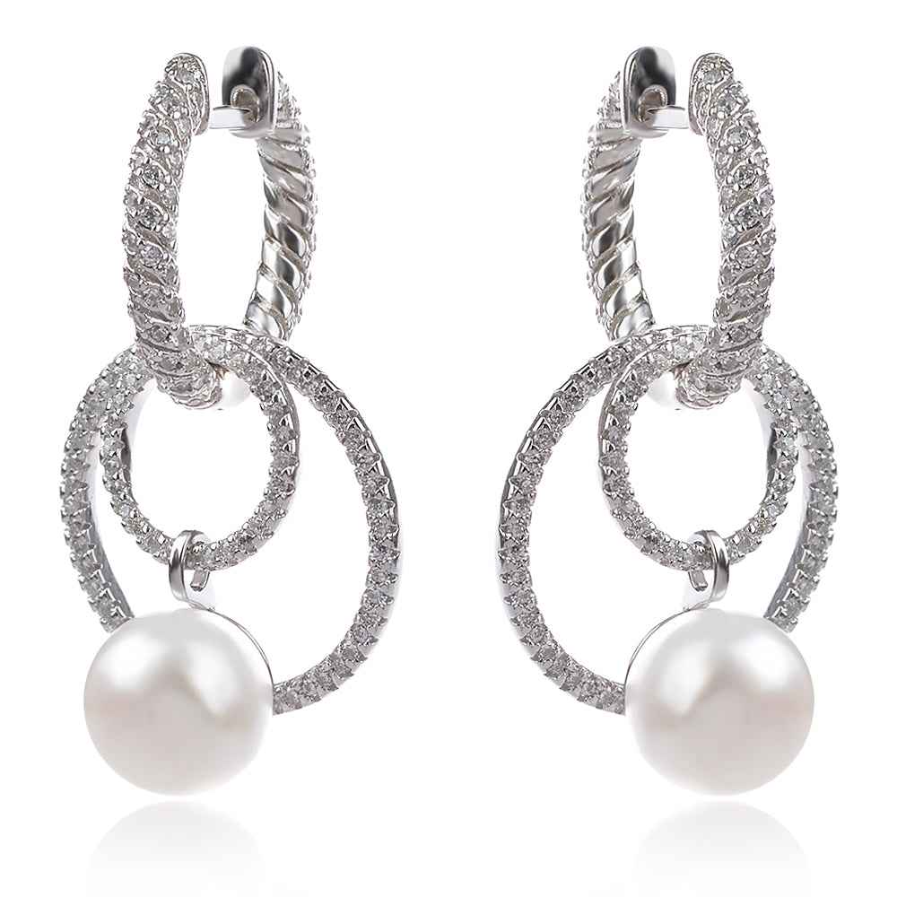 Сребърни обеци с бяла култивирана перла и малки инкрустирани цирконии. Тази геометрична каскада от подвижни халки, обсипани с блясък, омекотен от сатена на перлата, ще предадат изтънчен почерк както в ежедневието, така и при специални поводи. Модерната градска визия на обецата позволява лесното ѝ съчетание с различни визии. Една шик версия на любимия ни стил APM Monaco!