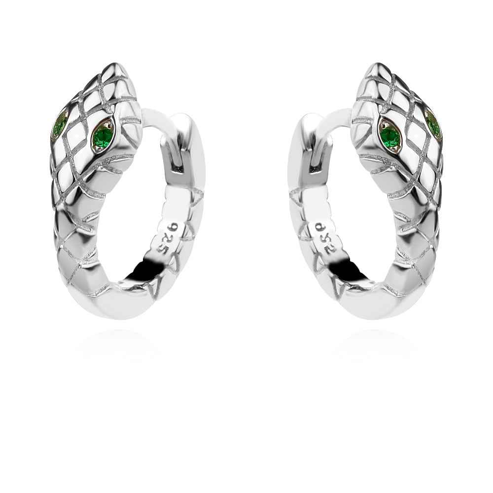 Очарователни малки сребърни обици халкички под форма на змия. Удобно закопчаване, страхотен дизайн и красива комбинация от бели и зелени цирконий. Бижу, което ще внесе елегантен шик във визията.