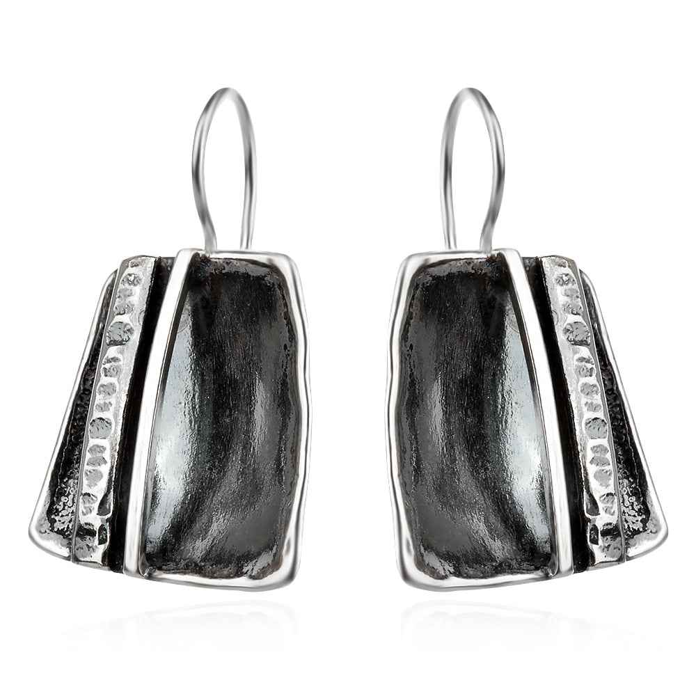 Сребърни обеци от българската ни колекция “Алгара”??. Обеците са с оксидация, която подчертава релефните декоративни елементи. Закопчаването е удобно и сигурно - с кукичка с ограничител.