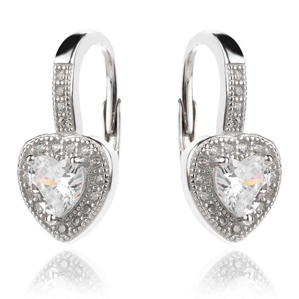 Сребърни обеци с мъничък циркон шлифован във форма на сърце. Обеците са на удобно закопчаване с лостче на панта и красиво прилягат към всяка ушна мидичка. Вербилото е красиво инкрустирано с малки камъни. Родиевото покритие предпазва бижуто от оксидация и гарантира дълготрайния му блясък.