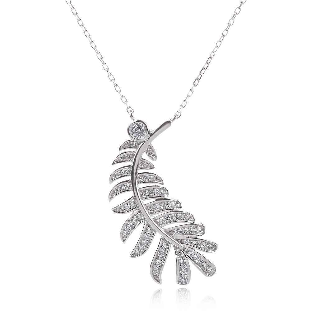 Сребърно колие "Перо" обсипано с цирконии. Едно изключително нежно бижу, символизиращо свобода на духа, безграничност, лекота, полет на въображението. Родиевото покритие и перфектната полировка гарантират дълготрайния блясък на бижуто, а камъните са инкрустирани в четири зъбни сребърни каси. Синджирчето е гъвкаво и позволява корекция на дължината с 5см.