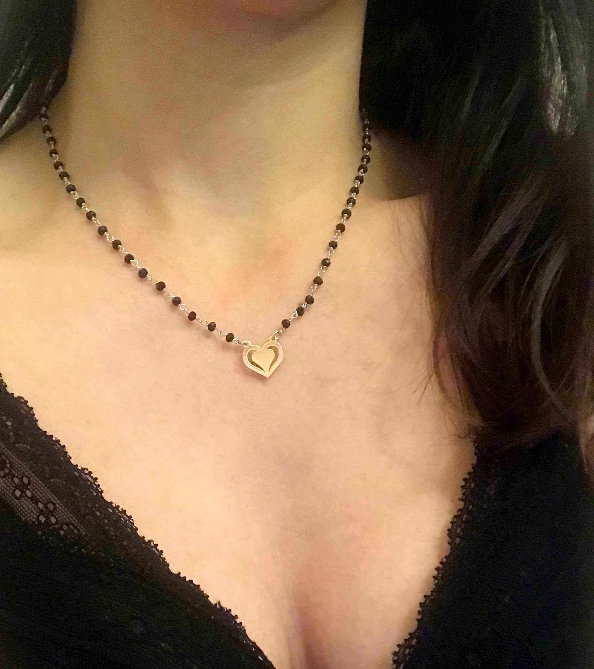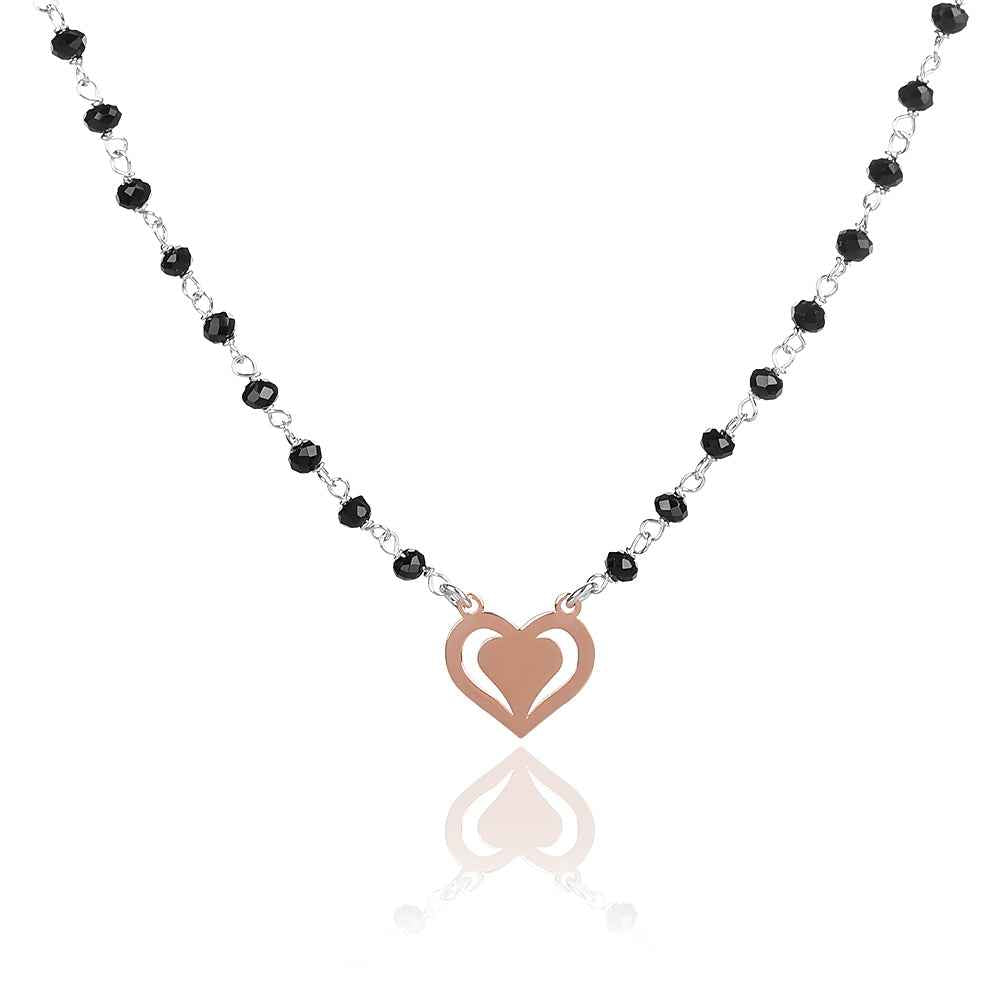Сребърно колие със сърце в розова позлата и малки фасетирани сферички от черен оникс по цялата дължина на синджирчето. Това тренди бижу ще се съчетае перфектно както с ежедневен топ, така и с вечерна визия. Страхотен акцент за деколтето!