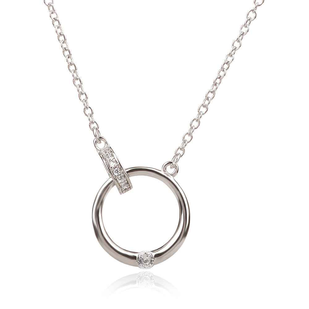 Нежно сребърно колие от два преплетени кръга с инкрустирани цирконии и синджирче с класическа плетка. Перфектната полировка и родиевото покритие гарантират дълготрайния блясък на бижуто. Колието символизира задружност и привързаност и би се превърнало в чудесен подарък с послание.