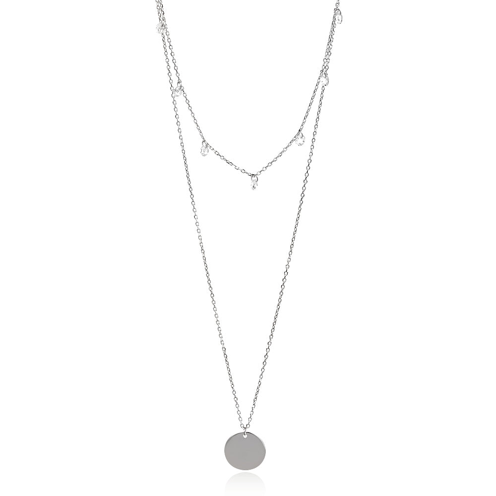 Двойно сребърно колие с родиево покритие и цирконии.Това модно украшение включва късо синджирче с циркони и дълго синджирче с монета. Дължината на колието може да се коригира с 5 см чрез удобен удължител от халки в края на синджирчетата.