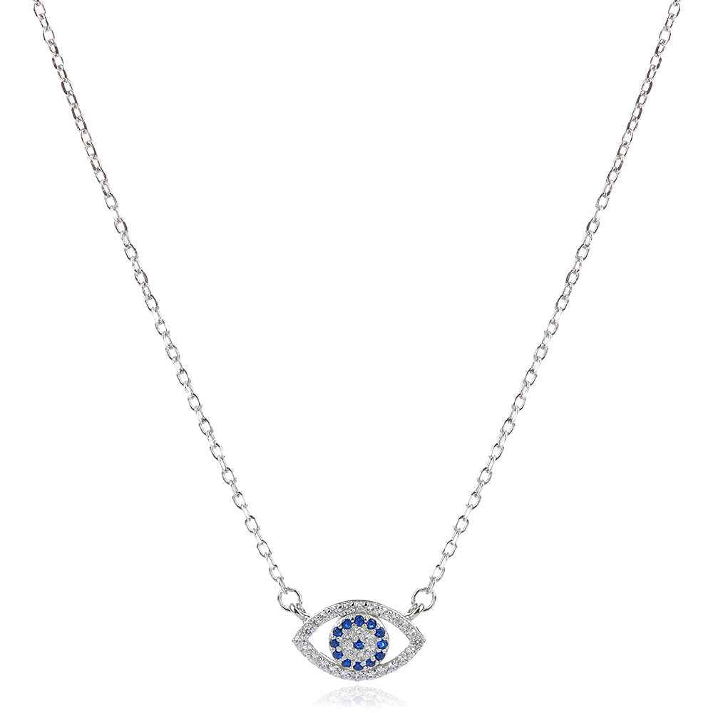 Това изящно сребърно колие с окото на Назар съчетава в себе си фин стил и силна символика. В центъра му блести класическият син талисман, познат още като око против уроки – древен символ, който се вярва, че предпазва от негативна енергия, зли помисли и завистливи погледи.