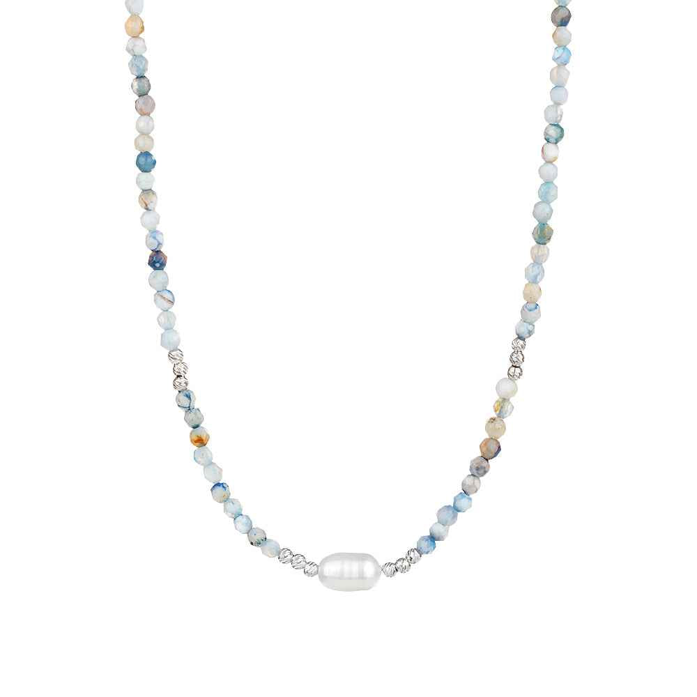 Нежен наниз от пастелни мъниста от естествен халцедон с барокова перла в центъра – свеж и хармоничен акцент, завършен със сребърна закопчалка.