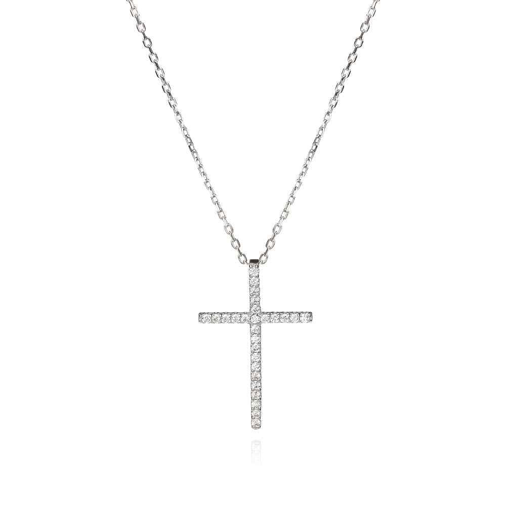 Сребърно колие с класическо кръстче с цирконии на късо гъвкаво синджирче. Деликатно бижу, символ на вяра, духовност и божествена защита. Бижуто е с прецизно родиево покритие, което предпазва среброто от оксидация и запазва блясъка на бижуто.