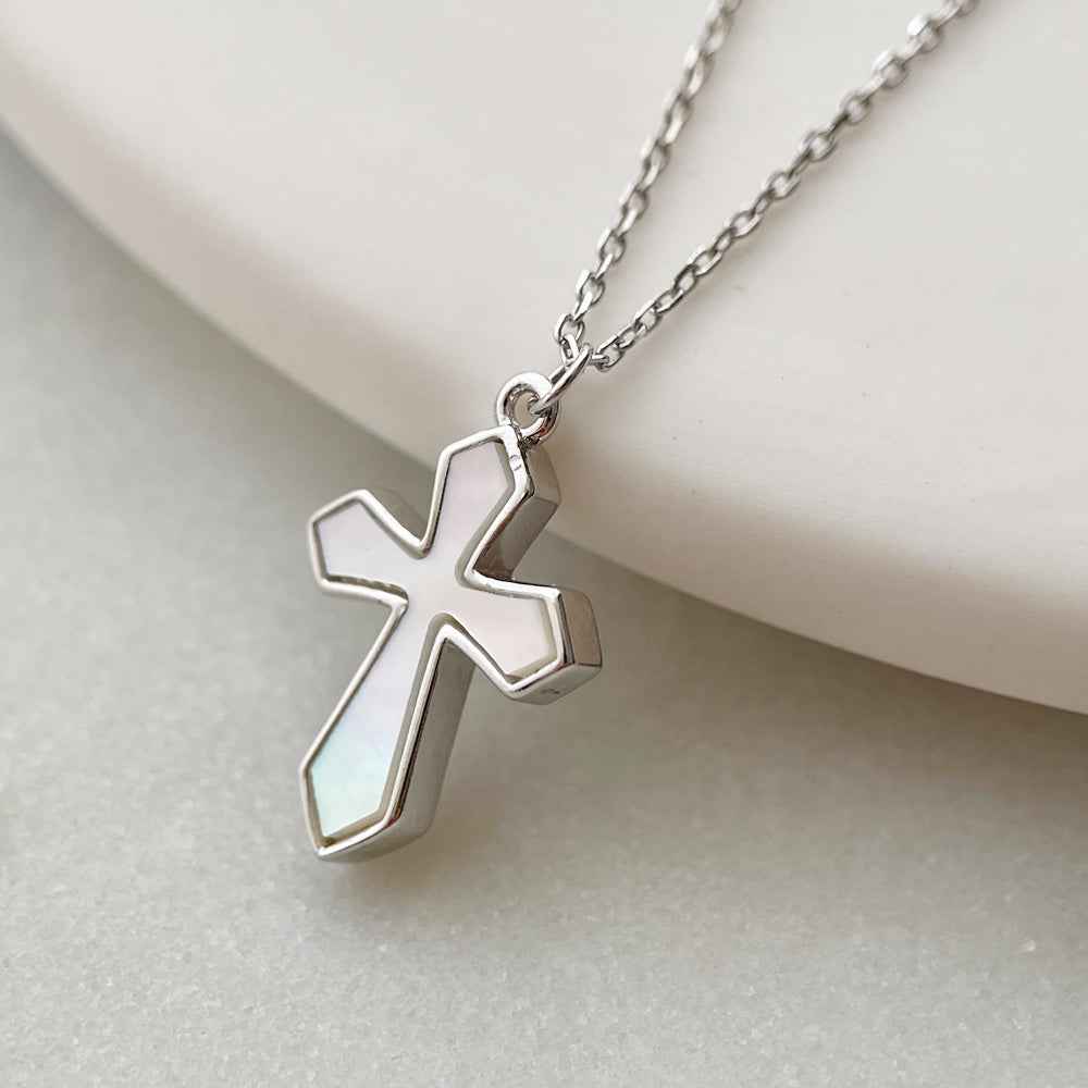 Сребърно колие с кръстче с две лица- едно обсипано с цирконии и едно с естествен бял седеф. Кръстчето е комбинирано с късо гъвкаво синджирче.