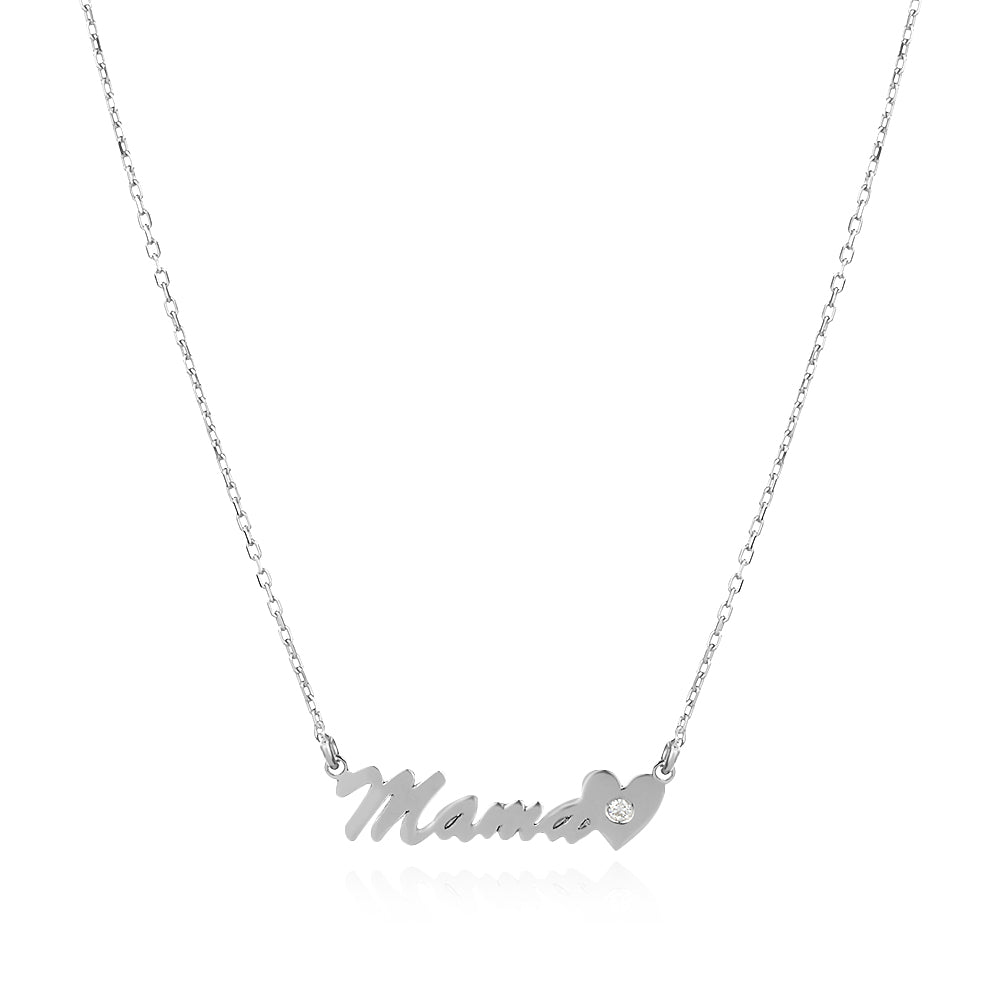 Сребърно колие с надпис “Мама”, което символизира безкрайната любов и нежност. Малък инкрустиран диамант добавя фин блясък и подчертава специалното послание на това бижу.