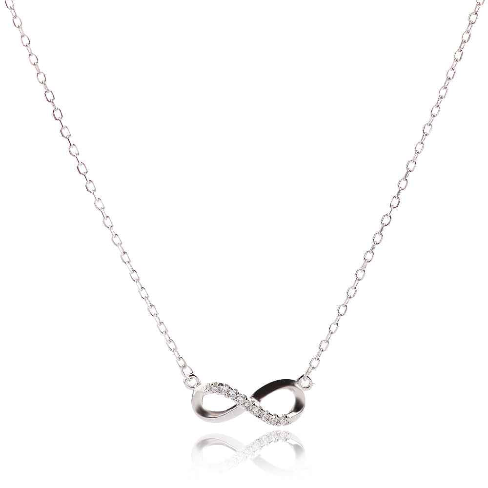 Нежно сребърно колие със знак за безкрайност с инкрустирани циркони. Родиевото покритие гарантира дълготрайния блясък на бижуто, а удължител в края на синджирчето позволява удобно коригиране на дължината.