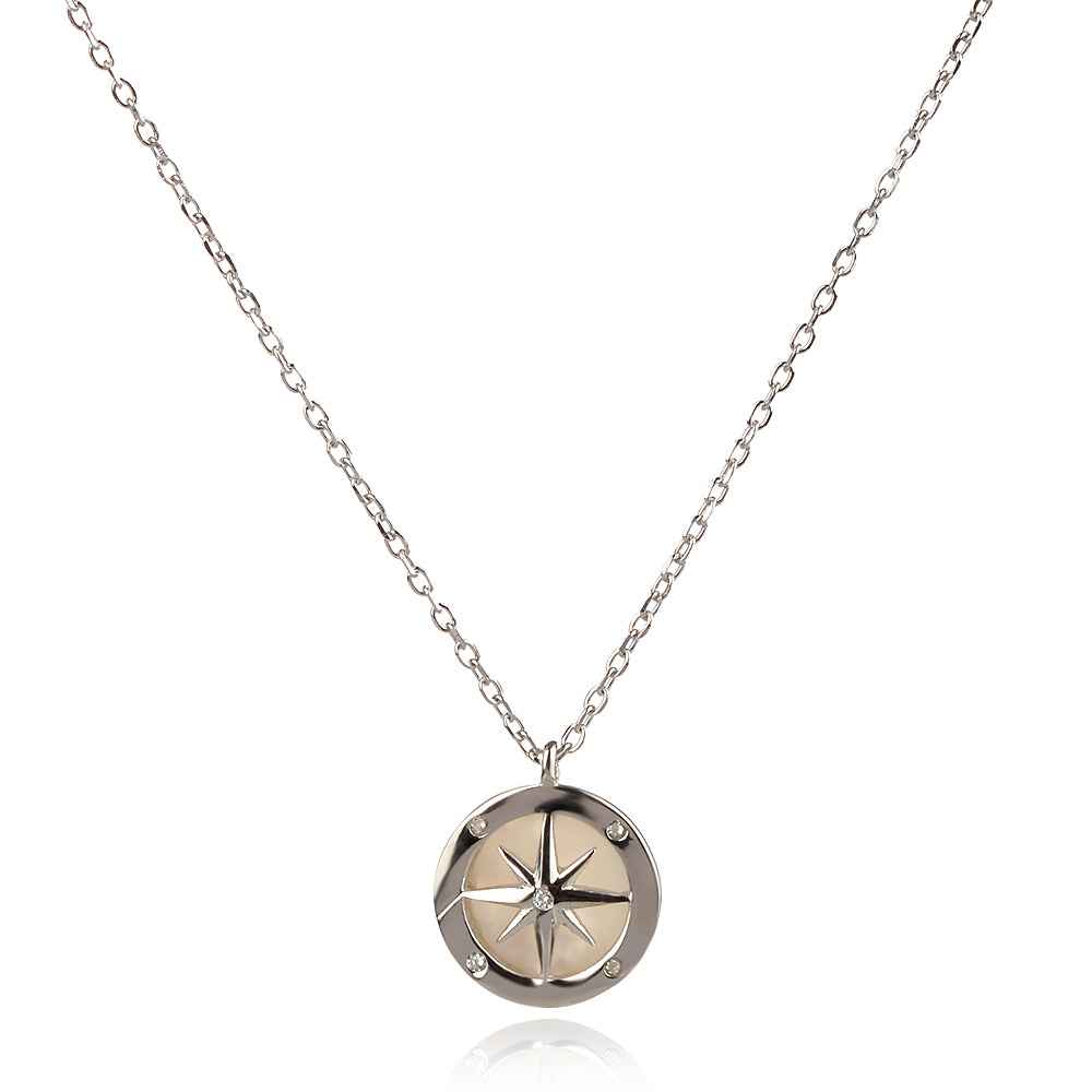Минималистично сребърно колие с фино гъвкаво синджирче и медальон компас с инкрустиран бял седеф, перфектна полировка и прецизно родиево покритие, което предпазва среброто от оксидация. Какъв по-добър талисман в стремежа ни да открием посока към щастието.