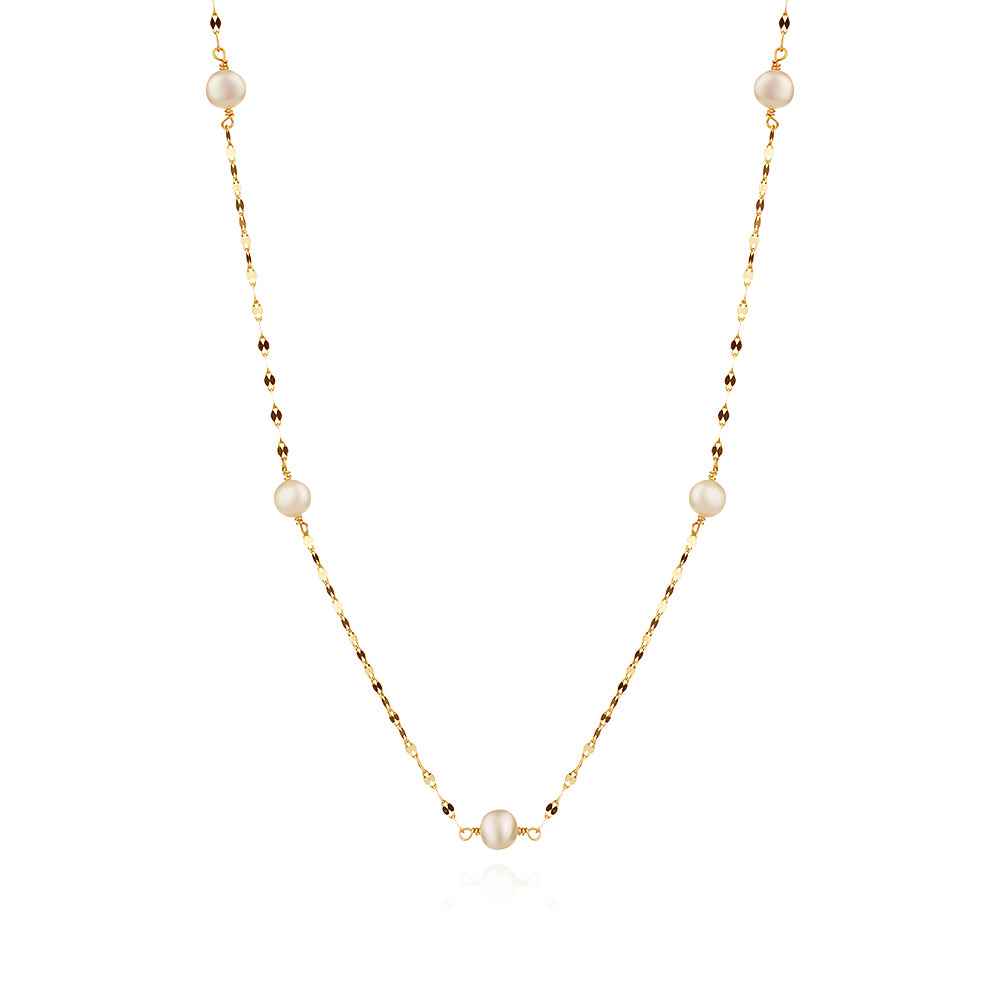 Модерен прочит на класическите перли. Приказно сребърно колие с перли, вплетени в нежен гъвкав синджир с позлата и релефен дизайн, който красиво отразява светлината при всяко движение.