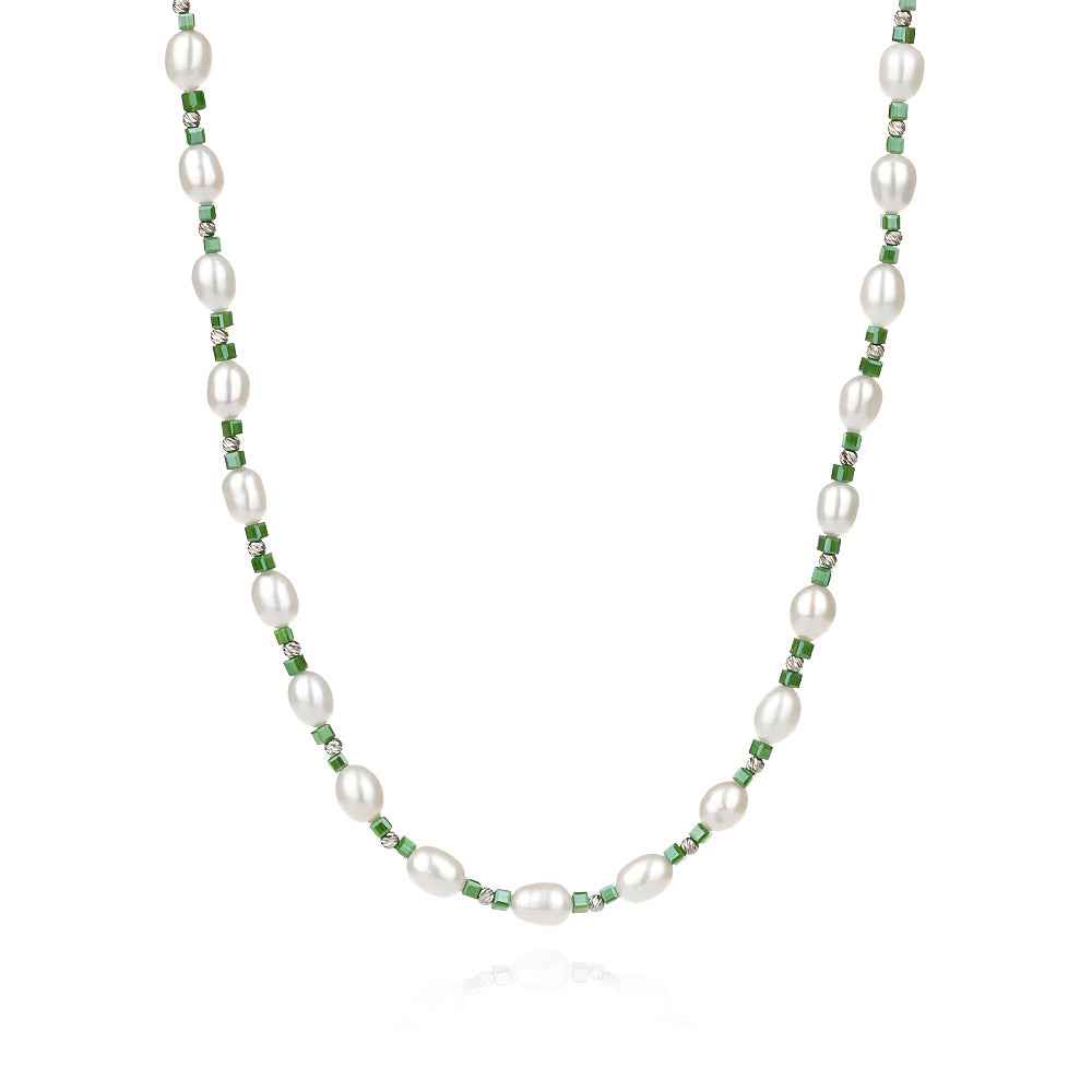 Модерна интерпретация на вечната перлена класика. Наниз от калибровани бели перли и мъниста от зелен кварц. Колието е със сребърна закопчалка.