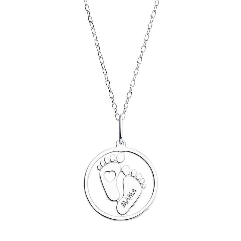 Сребърно колие с малки бебешки крачета и гравиран надпис МАМА. Едно сантиментално бижу, което ще развълнува всяка млада майка и ще запечата най-сладките моменти от майчинството.