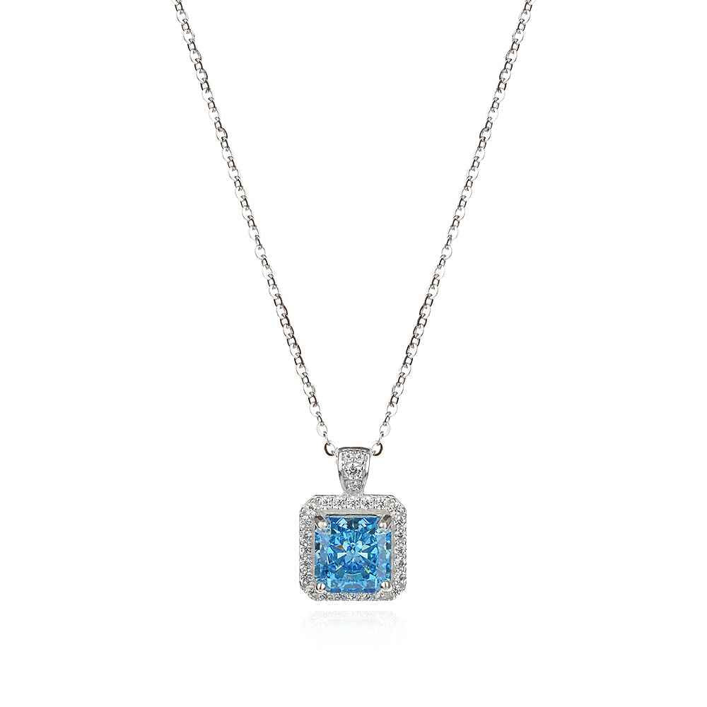 Забележително сребърно колие с квадратен син кубичен цирконий с ice cut шлифовка, обграден от сияен ореол от бели цирконии. Поставено на елегантно гъвкаво синджирче с регулируема дължина – създадено за специалните моменти.