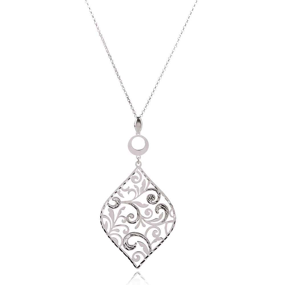 Ажурно италианско сребърно колие с флорални мотиви и изискана ромбоидна форма. Прецизната полировка и фабричното родиево покритие предпазват среброто от оксидация и създават красив блясък.