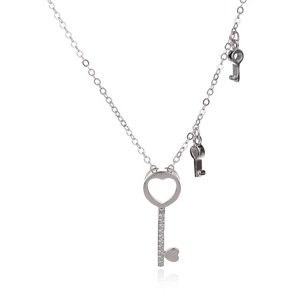 Сребърно колие "Ключ към сърцето". Нежен перфектно полиран ключ с инкрустирани малки цирконии на деликатно синджирче с две мини чарм- ключета. Фино малко украшение с послание- разкошен подарък за любим човек.