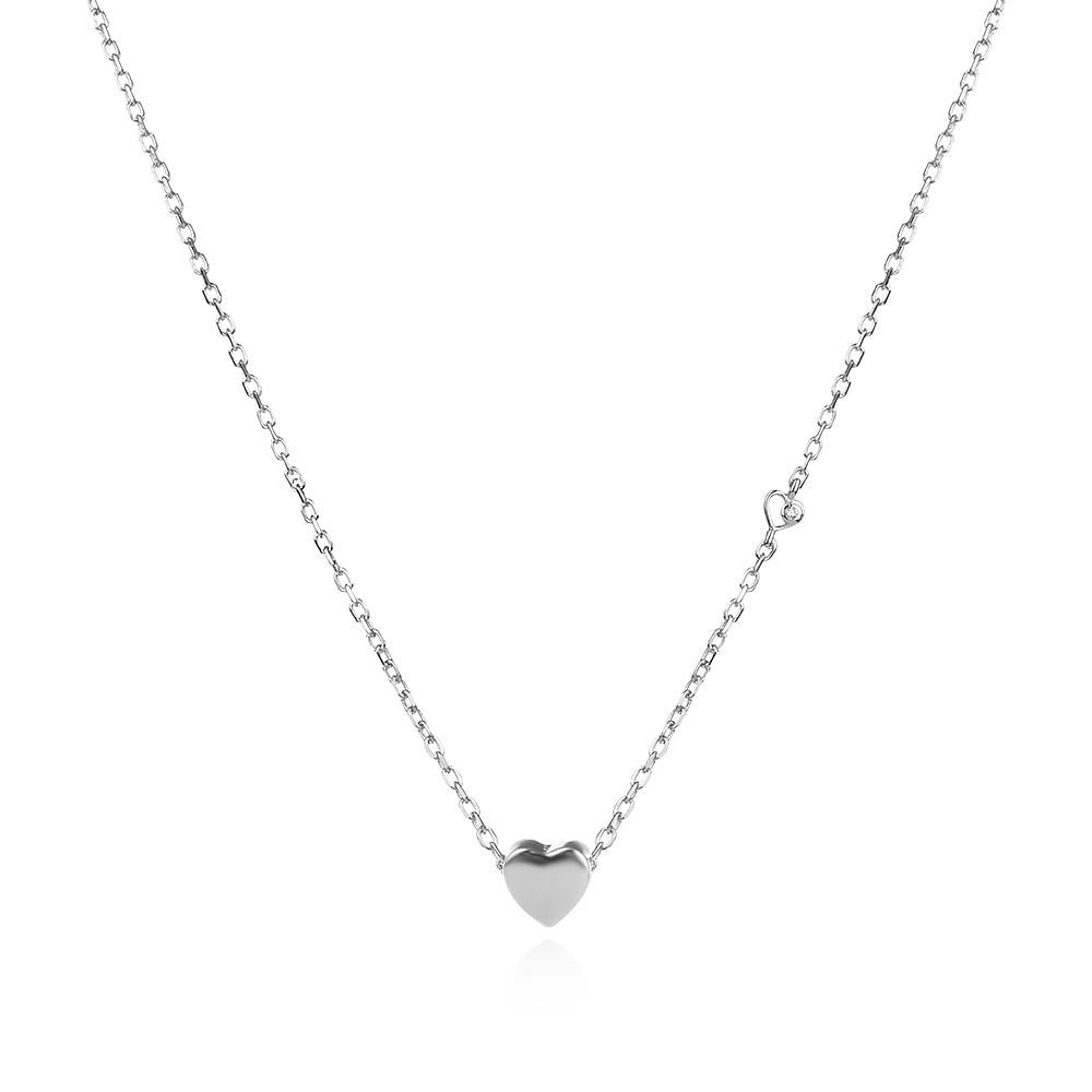 Сребърно колие с миниатюрно полирано до блясък сърце. Родиевото покритие запазва блясъка на бижуто, а удължител в края на синджирчето позволява удобно коригиране на дължината.