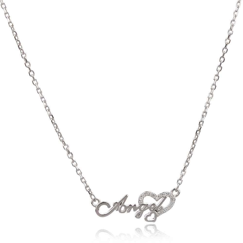 Нежно сребърно колие с наспис Angel и сърце инкрустирано с циркони. Бижуто е с родиево покритие, което предпазва среброто от потъмняване. Дължината на синджира е 44см, а удължител от халкички позволява лесна корекция с още 5см.