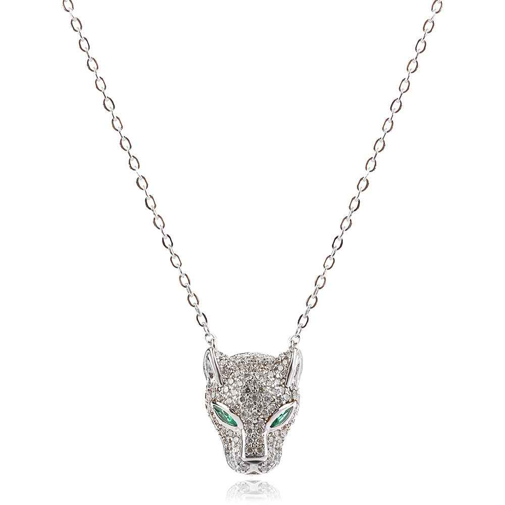 Сребърно колие с детайлна пантера, обсипана с цирконии. Колието е с фабрично родиево покритие, което предпазва среброто от оксидация и запазва блясъка на бижуто.