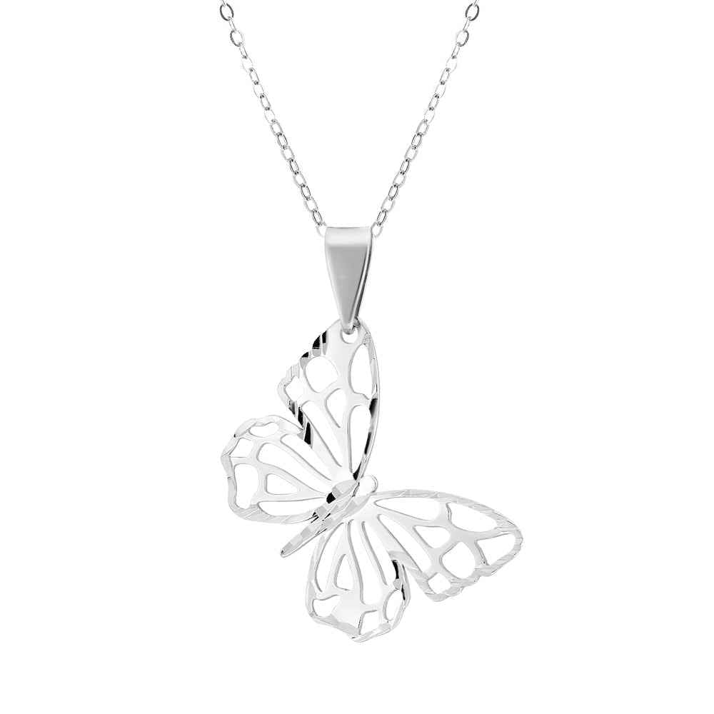 Ефирно сребърно колие във форма на красива ажурна пеперуда. Колието е с прецизно родиево покритие и лазерна обработка за сияен блясък, който наподобява инкрустация на камъни.