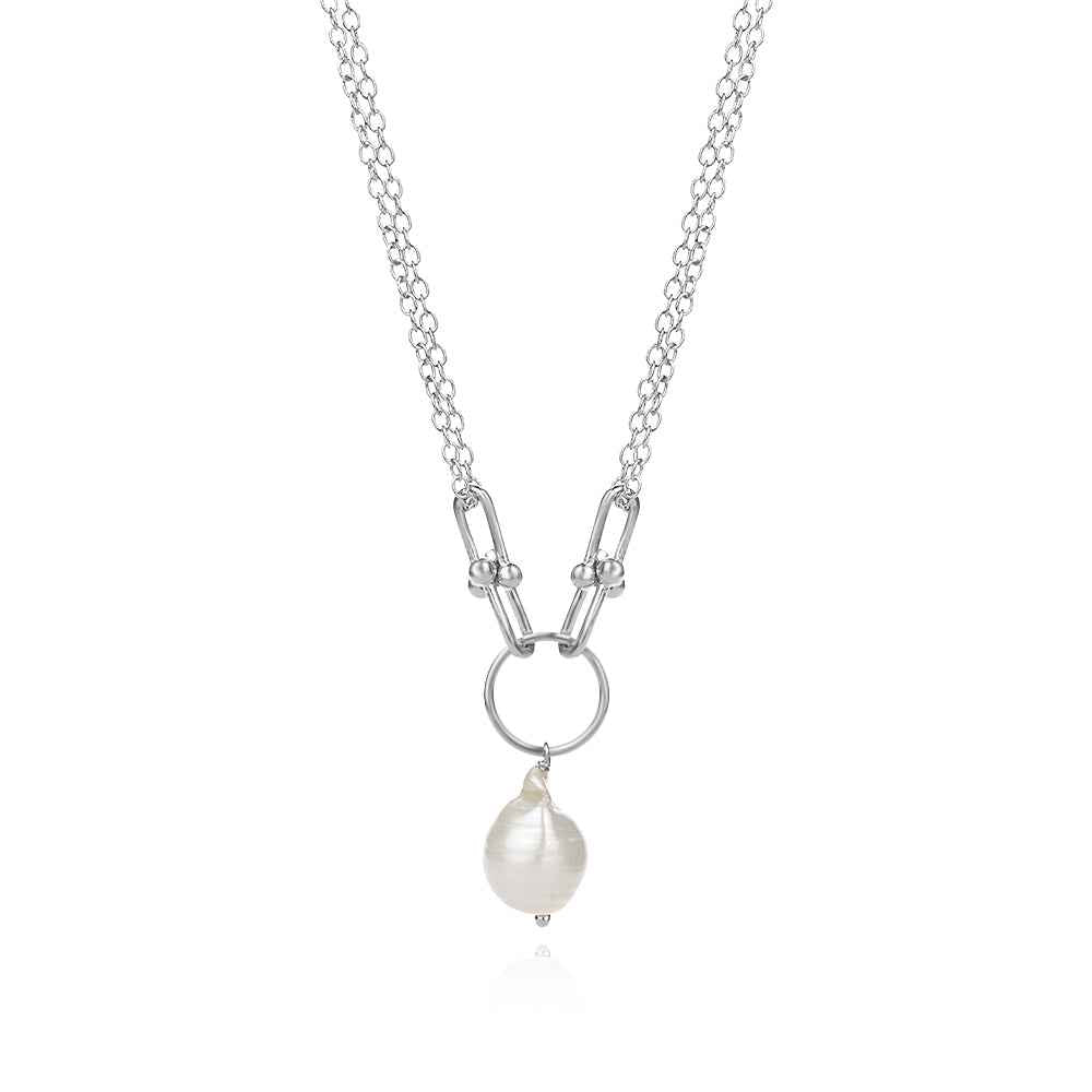 Сребърно колие с модерен дизайн, акцентен синджир и красива бяла барокова перла. Разкошно украшение- нов прочит на вечната класика-перлите. Бижуто е с италианско родиево покритие, което предпазва среброто от оксидация.