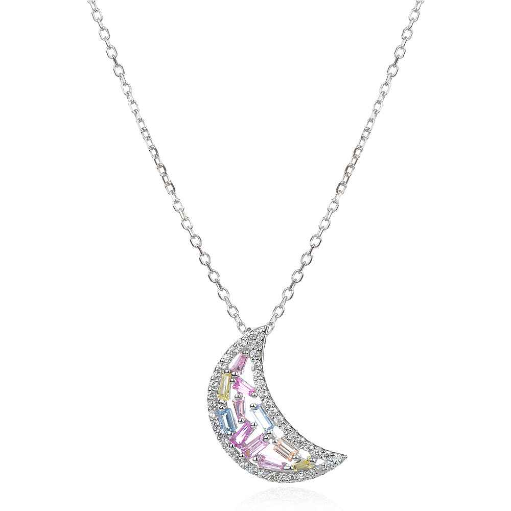 Приказно сребърно колие луна, обсипано с цветни цирконии багети в нежни пастелни цветове. Прецизно родиево покритие предпазва среброто от оксидация. Гъвкавото синджирче е с удължител от халкички за лесна корекция на дължината.