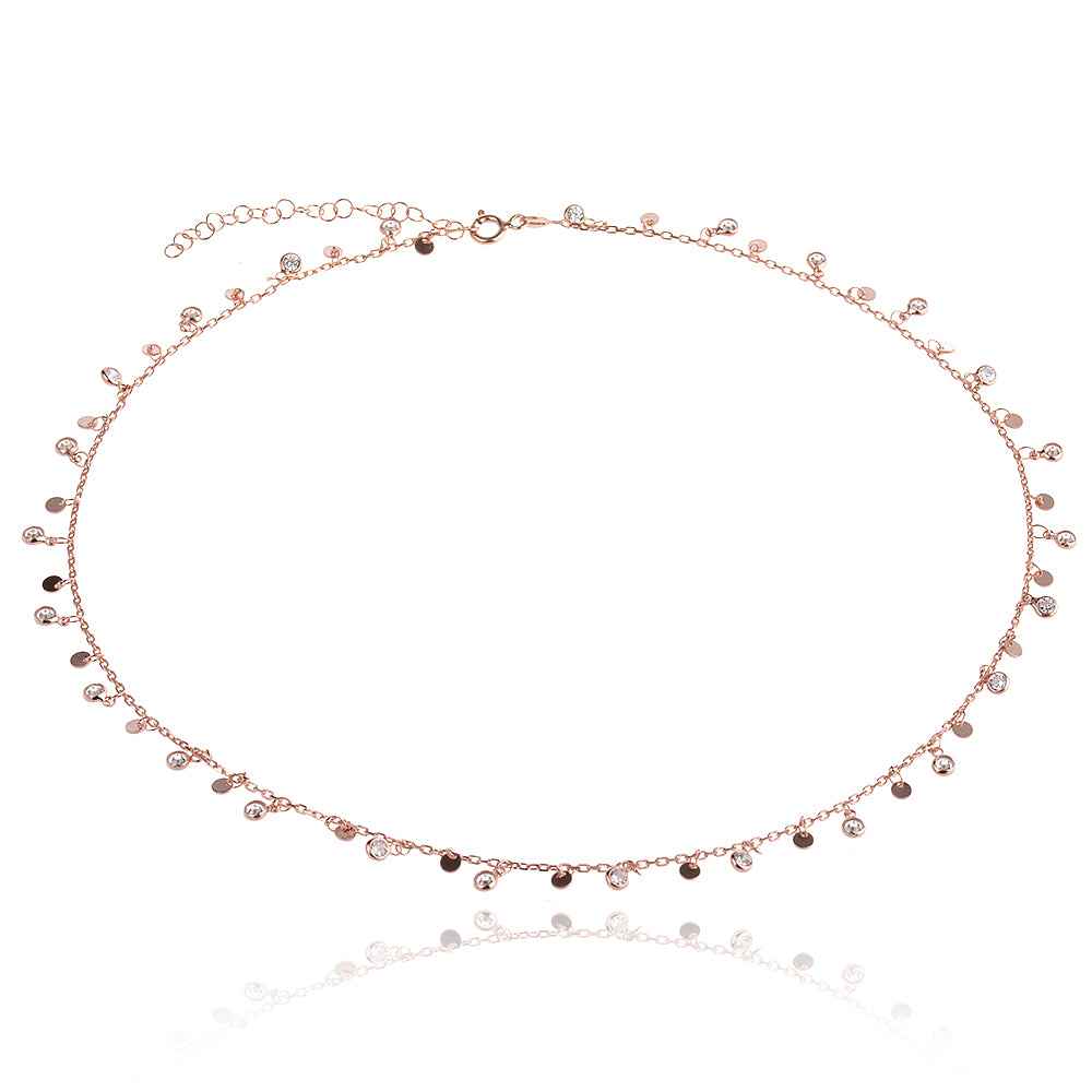 Нежно сребърно колие с миниатюрни полирани монети и трептящи циркони в сребърен обков. Бижуто е с розова позлата.
