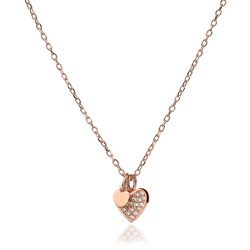 Нежно сребърно колие със сърца с розова позлата. Колието е с фино гъвкаво синджирче с удължител от халкички в края, което позволява лесна корекция на дължината с 5см.