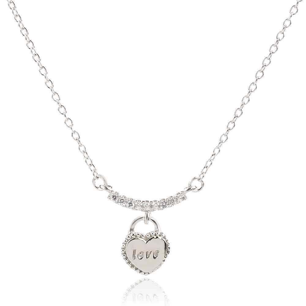 Сребърно колие с малко полирано сърчице с надпис LOVE и дъга от бляскави цирконии. Финото синджирче е с удължител от халкички за удобно регулиране на дължината. Родиевото покритие подсилва блясъка на среброто и го предпазва от оксидация.