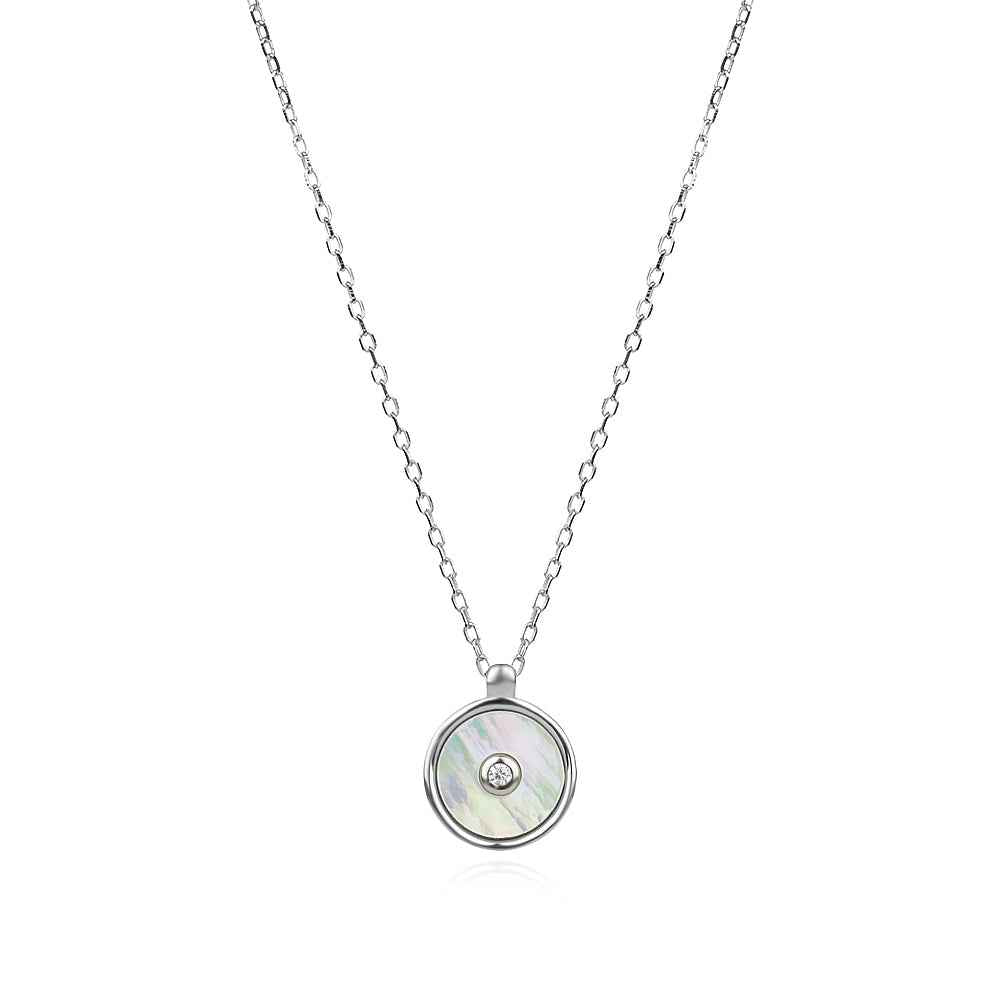 Нежно минималистично сребърно колие със седефена кръгла плочка и малко камъче в средата за лек и деликатен блясък. Синджирчето е с удължител от халкички за лесна корекция на дължината. Бижуто е с прецизно родиево поритие, което предпазва среброто от оксидация.