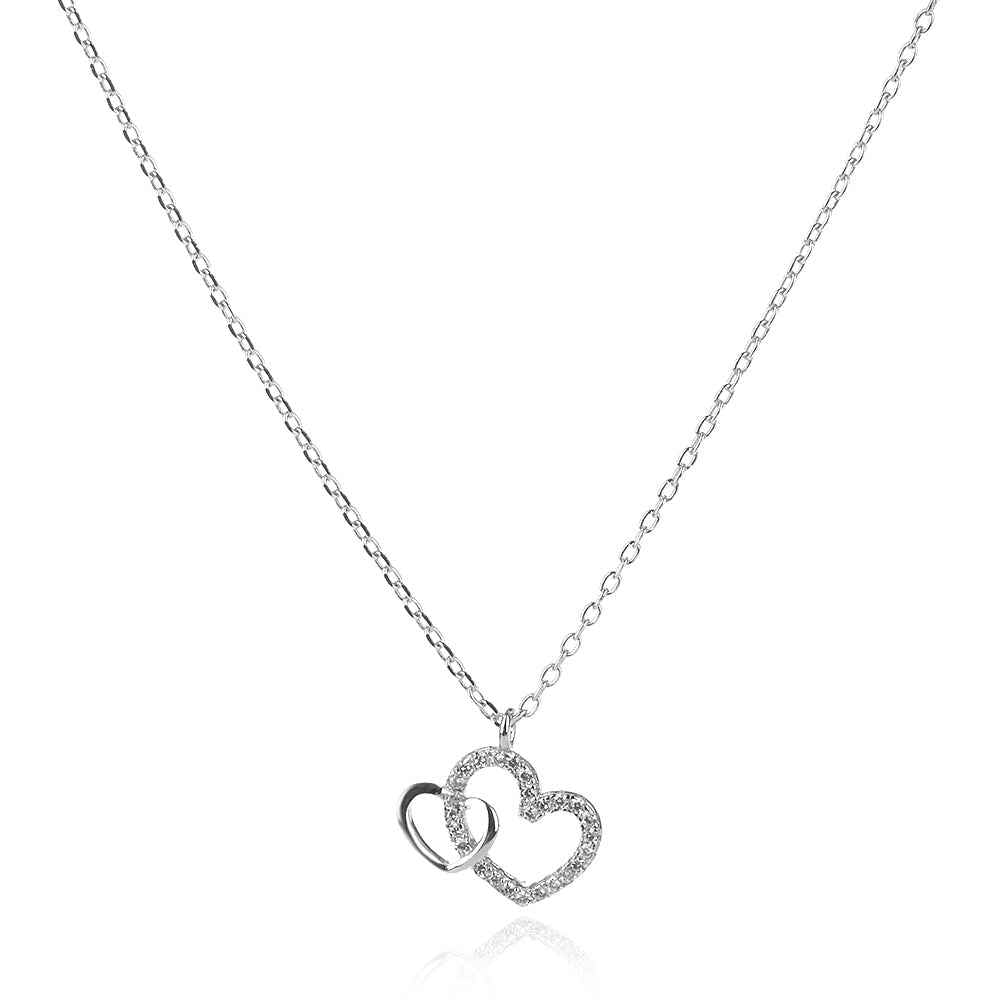 Сребърно колие от две преплетени сърца- нежно и ефирно символично бижу. Прецизното родиево покритие гарантира дълготрайния блясък на бижуто, а удължител в края на синджирчето позволява удобно коригиране на дължината. Изящен подарък за любим човек.