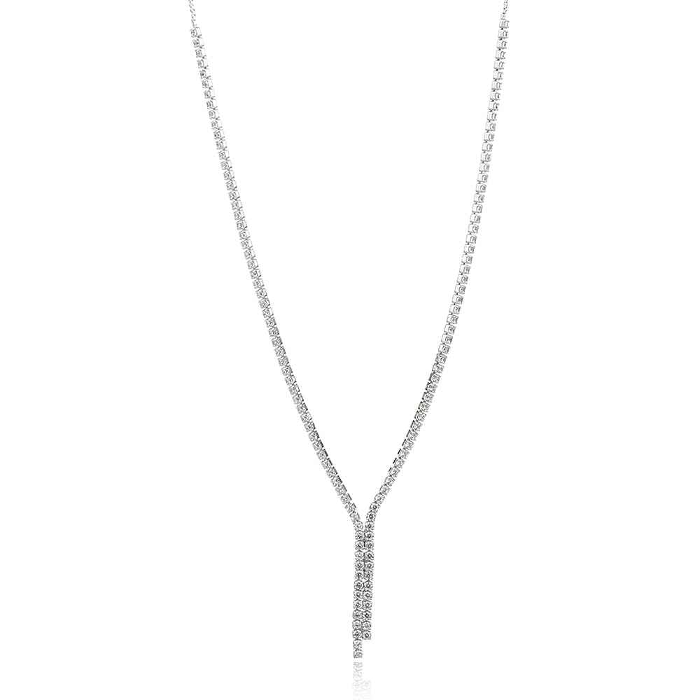 Нежно сребърни колие с циркони. Всеки камък е монтиран в сребърна каса, а фабрично родиево покритие предпазва среброто от оксидация и гарантира неговия блясък.