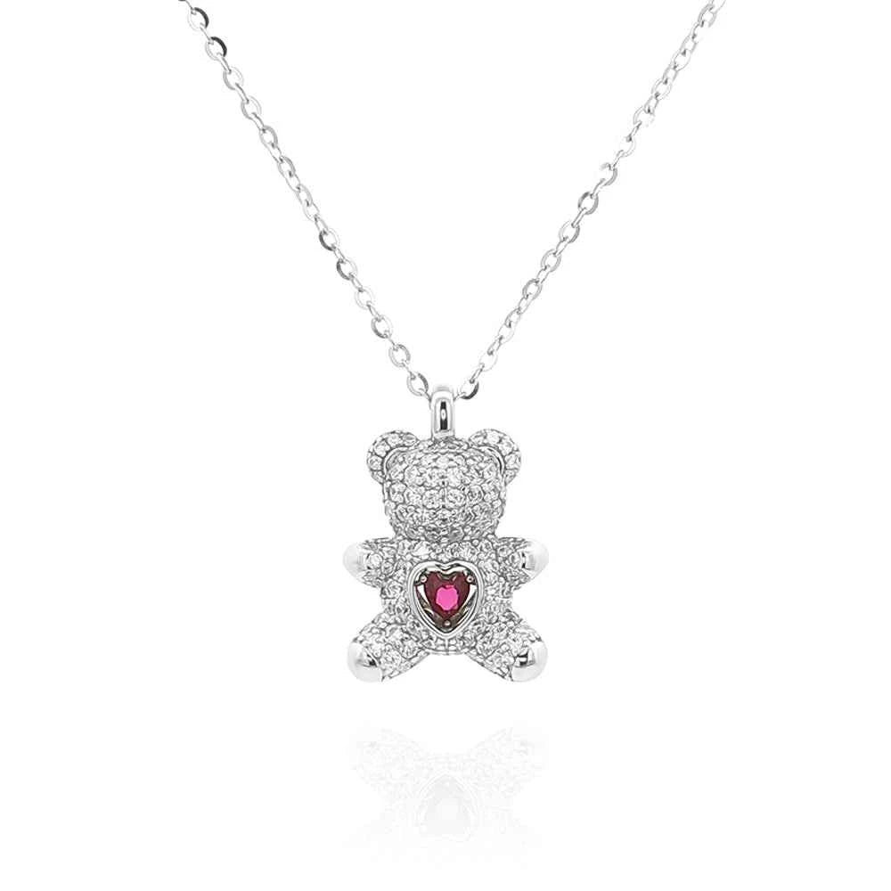 Игривo и блестящo – това колие със сребърно мече, обсипано с цирконии и малко сърце в рубинен оттенък, съчетава нежност и закачливост. Родиевото покритие гарантира дълготраен блясък, а дизайнът е създаден за жени, които обичат да се открояват с уникални детайли.
