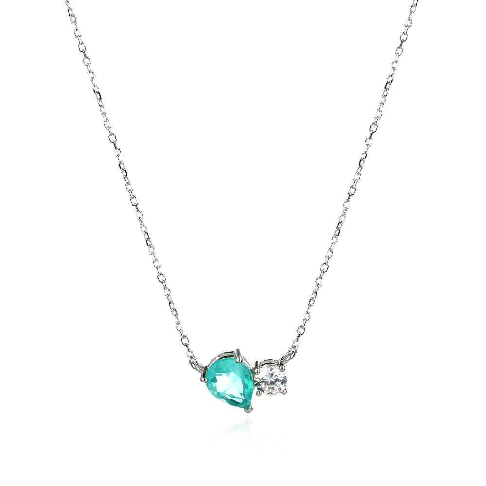 Сребърно колие Toi et Moi с два кубични циркони в бяло и светло зелено в кръгла и капковидна форма. Бижуто е с родиево покритие, което предпазва среброто от оксидация. Финото синджирче е с удължител от халкички за лесна корекция на дължината с няколко сантиметра.