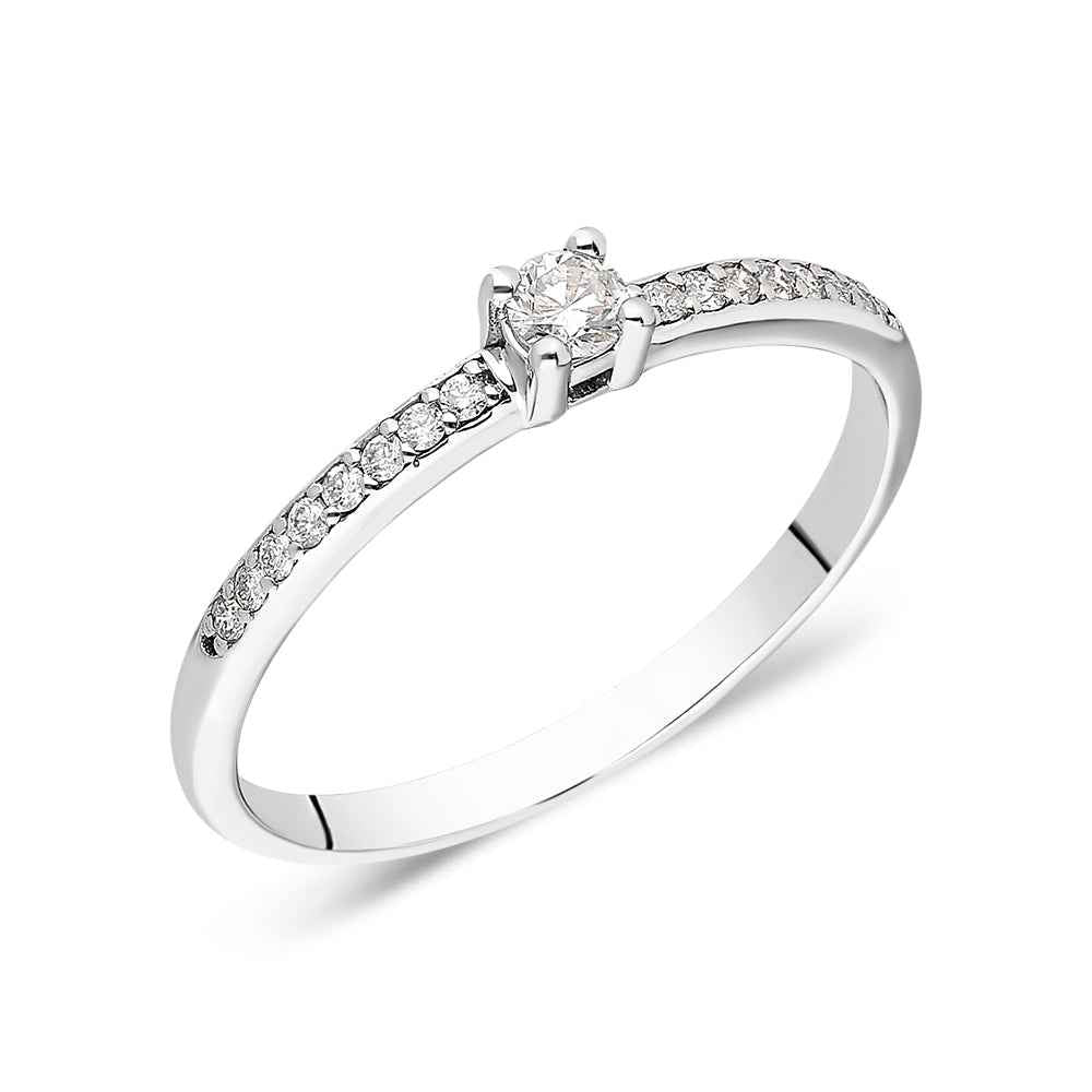 Класически годежен пръстен от 14K бяло злато с естествено добити диаманти. Пръстенът е наличен в размер 53 и при необходимост може да бъде коригиран с до 2 размера в рамките на три работни дни. Първата корекция на размера е безплатна.