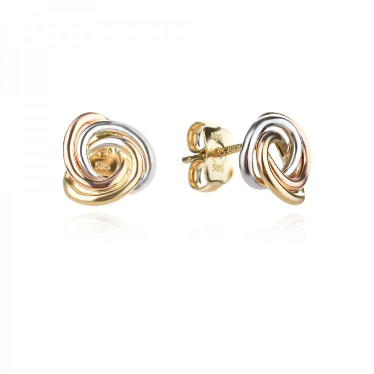 Златни дамски обеци по ухото във формата на малко възелче. Модерен минималистичен дизайн, изработен от 14К бяло, розово и жълто злато. Обеците са с прецизна полировка, а закопчаването е на щифт.