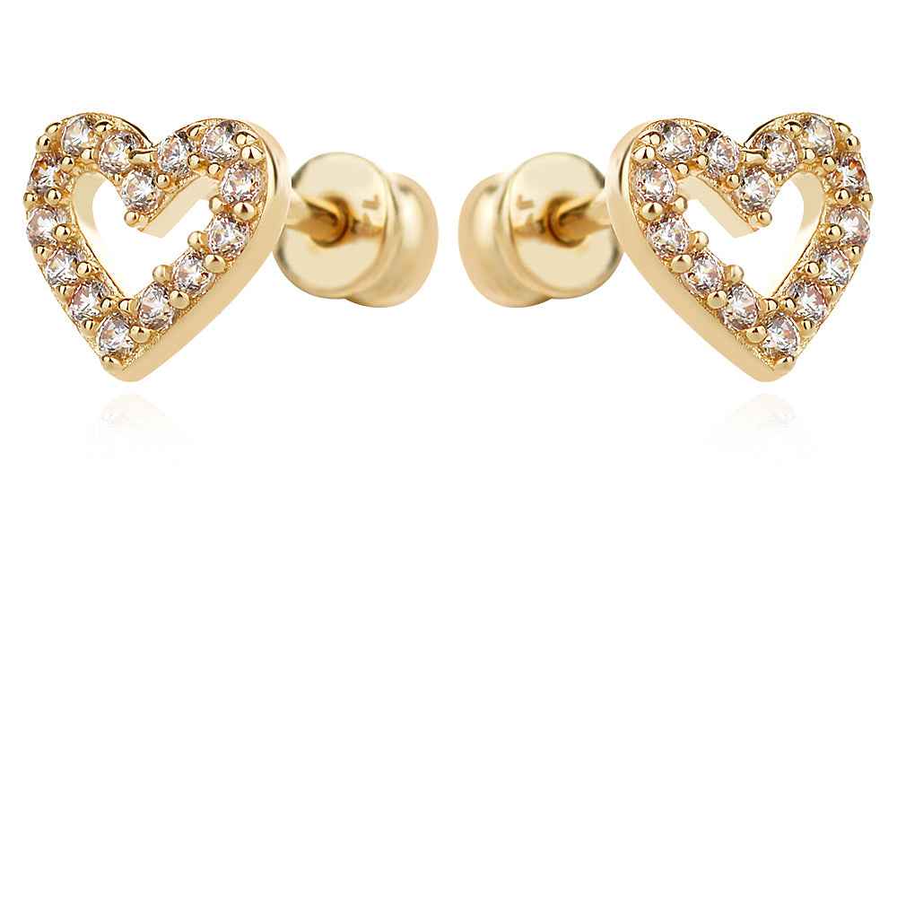 Малки обеци сърчица, изработени от 14К жълто злато с цирконий. Обеците са с прецизна изработка и удобно надеждно закопчаване на щифт с винт на резба, който фиксира бижуто сигурно на ухото, не се закача в косата и по дрехите и не убива по време на сън. Обиците са подходящи и за дечица.
