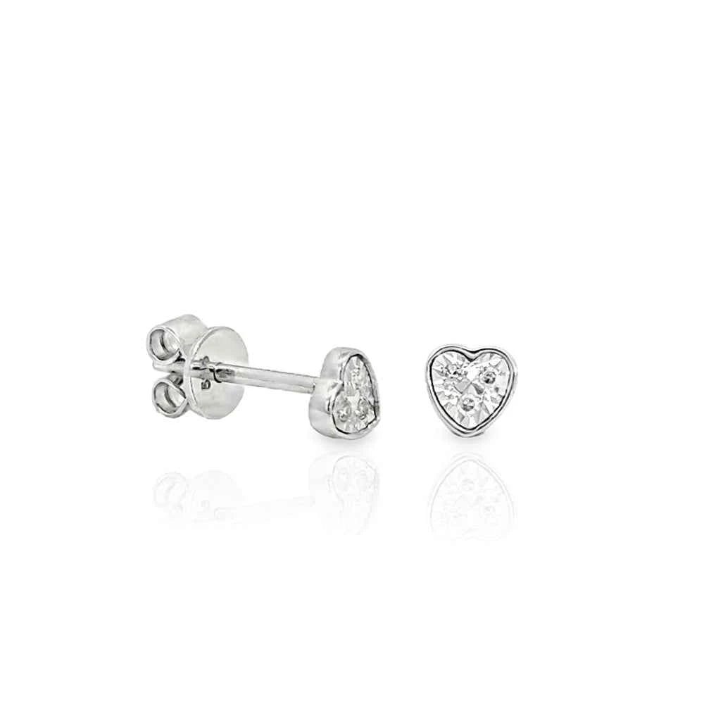 Малки обеци от 14к бяло злато с форма на сърце и естествено добити диаманти в mirror plate сетинг за максимален блясък. Закопчаването е на щифт. Компактния размер и минималистичен дизайн ги превръщат в класика, която никога не излиза от мода.