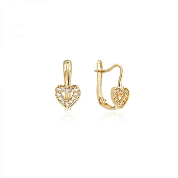 Детски златни обеци със сърца и циркони – изящен подарък за първите специални моменти.