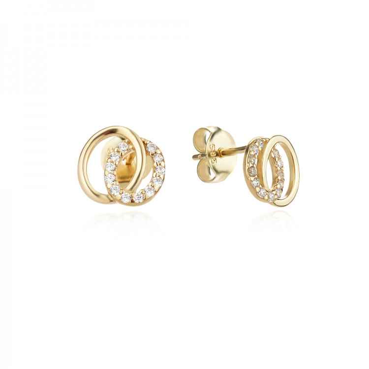 Малки златни обеци с модерен минималистичен дизайн, изработени от 14К жълто злато с цирконии. Обеците са с перфектна полировка, фина изработка и удобно закопчаване на щифт.