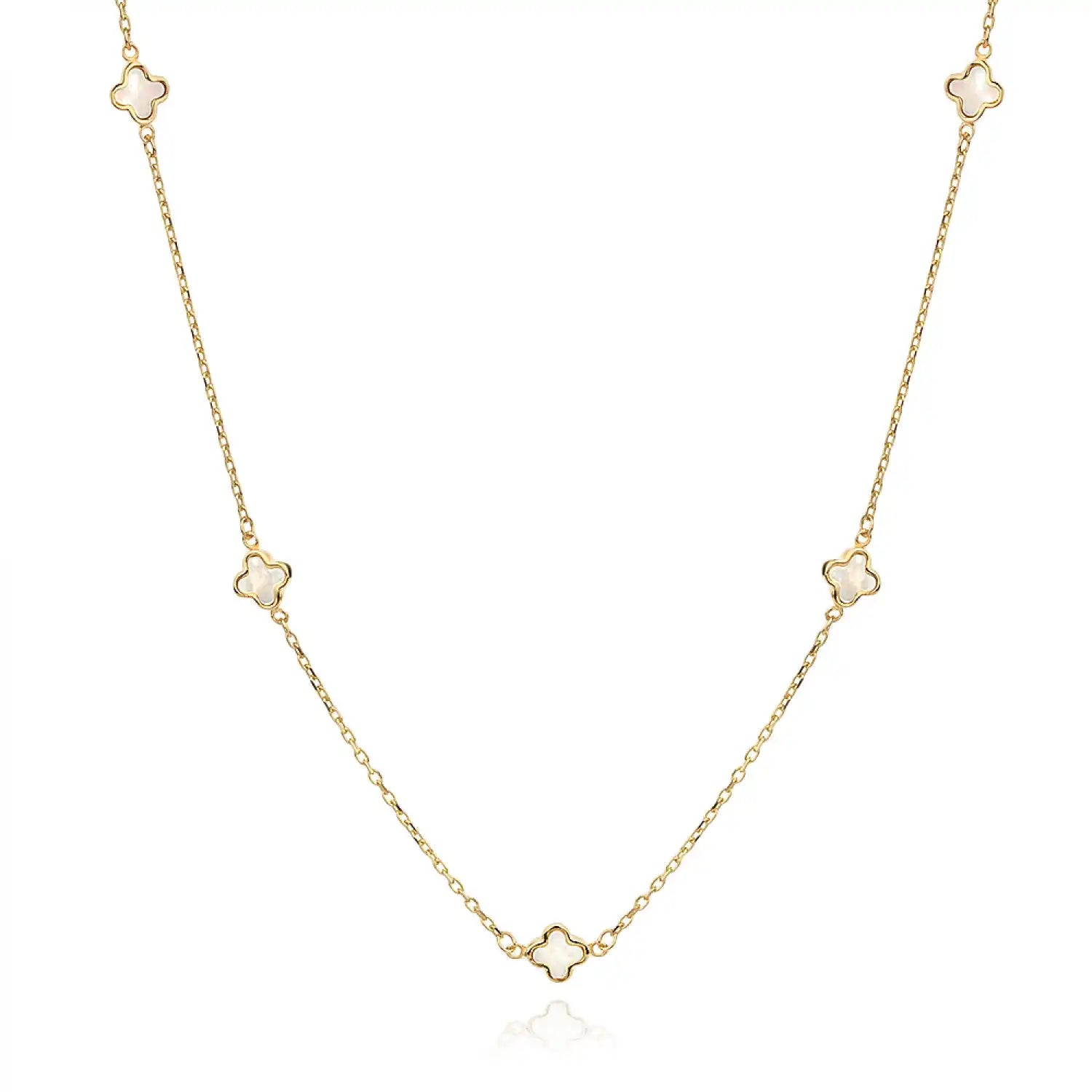 Елегантно златно колие с четирилистна детелина и седеф, 14К – символ на късмет и хармония.