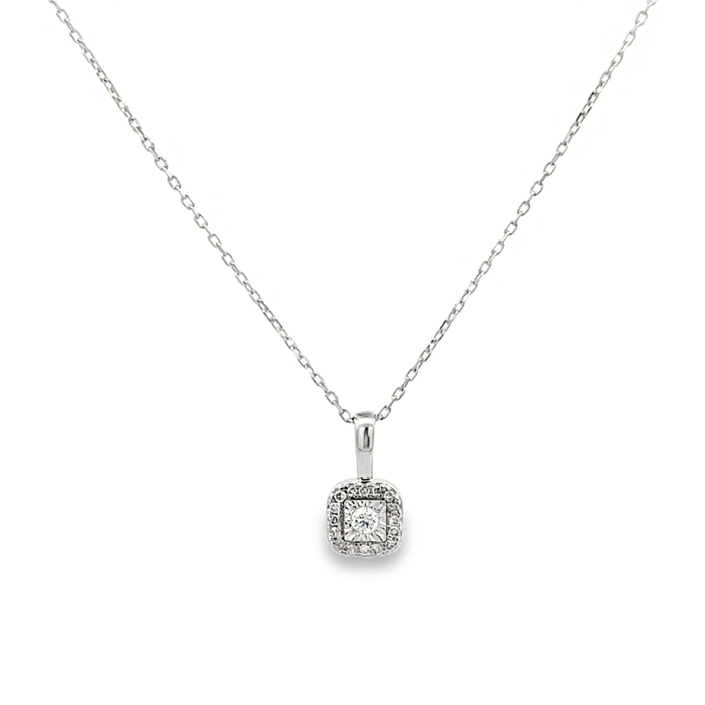 Фино колие от 14к бяло злато с малък квадратен медальон, обсипан с естествено добити диаманти. Централният диамант е с “mirror plate” инкрустация за максимален блясък. Любима класика, която никога не излиза от мода.